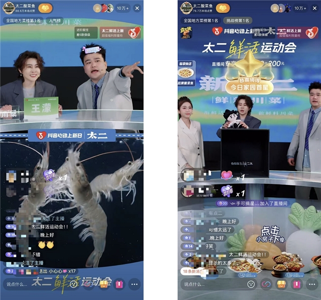 延续此前「鲜活运动会」的场景化直播思路,太二在此次菜品展示与互动环节中进一步强化这一概念,将后厨直接「搬」进抖音直播间——现切现炒、锅气升腾,在屏幕内外掀起了一轮鲜香扑面的川味热潮。用户不仅能直观看到制作过程,也能在动态场景中感知每一道菜的「鲜活」状态。